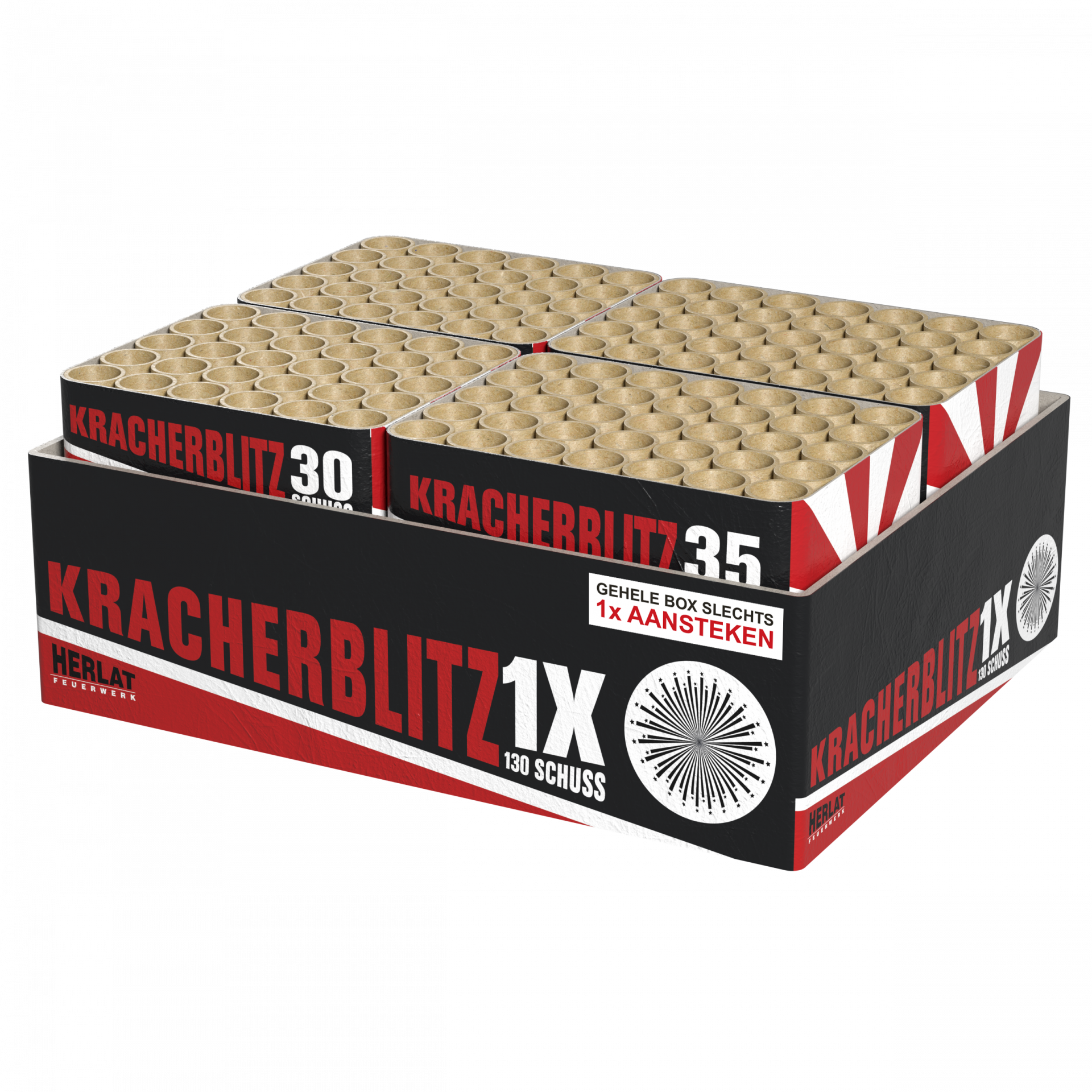 De Kracherblitz van Herlat bevat 4 doorverbonden cakes met elk 500 gram. Je krijgt 130 schoten voor heel weinig geld! Deze compound bevat maar liefst 2 kilo kruit!